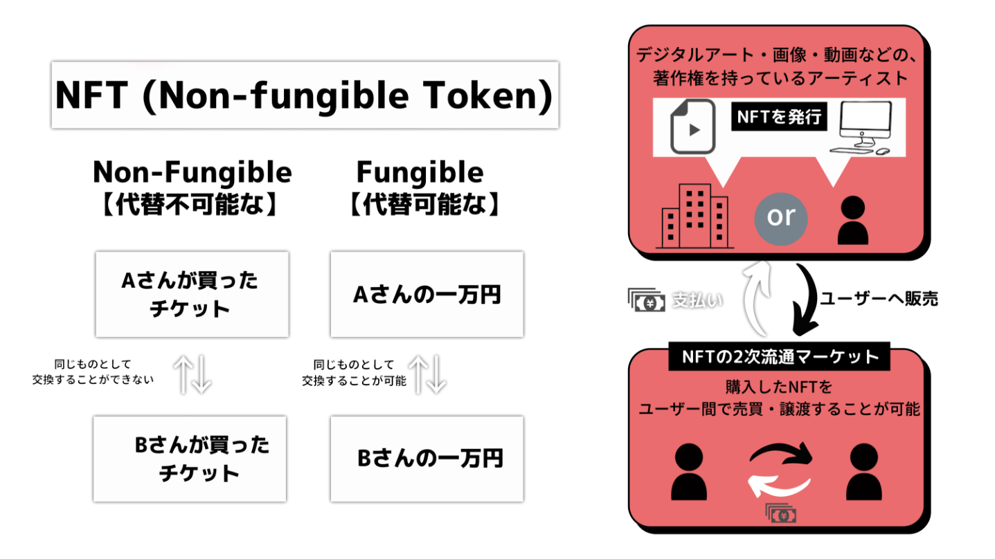 NFTとは、 Non Fungible Tokenの略で、 日本語では⾮代替可能性トークンと